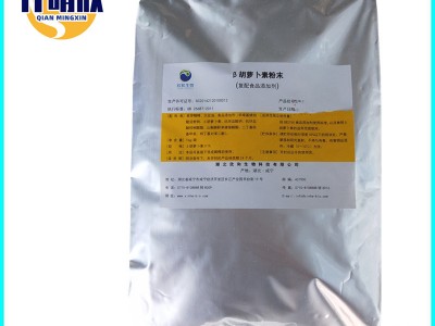 用途二:食用橙色色素;营养强化剂。主要用于人造奶油、面条、糕点、饮料和食品等。用途三:作营养强化剂和食品着色剂,按生产需要适量使用。用途四:作为饲料维生素营养强化剂和着色剂。用途五:营养增补剂和色素。按我国卫生部颁布的“食品营养强化剂使用卫生标准(1993)”规定,可用于奶油及膨化食品,使用量0.2g/kg。该品0.6μg的生理作用相当于1单位(I·U·)的维生素A。现广泛用作黄色色素代替油溶性焦油系色素,如用于原为就含有胡萝卜素的奶油、干酪、蛋黄酱等,并广泛应用于其他用途六:药物。饲料和食品添加剂。β—胡萝卜素作为一种食用油溶性色素,其本身的颜色因浓度的差异,可涵盖由红色至黄色的色系,因此受到食品业相当热烈的欢迎。其非常适合油性产品及蛋白质性产品的开发,如:人造奶油、胶囊、鱼浆炼制品、素食产品、速食面的调色等。而经过微胶囊处理的β—胡萝卜素,可转化为水溶性色素,的食品都可应用。
